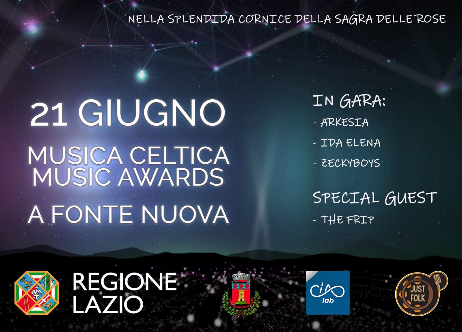 Ospiti della serata, i The Frip, vincitori dello scorso anno della competizione Best Performance che, quest’anno, vedrà alternarsi sul palco Arkesia, Ida Elena e Zeckyboys. Presenterà la serata Ixia. Sono attesi inoltre prestigiosi ospiti, come Maurizio Guccini che introdurrà e presenzierà all’evento insieme al Sindaco Umberto Falcioni, ed i nostri giudici in rappresentanza di: JustFolk Radio (venerdì h 17 su radiokaositaly.com ), Mister Folk (webzine misterfolk.com ), Fairyland (Guidonia 9-13 Luglio) e Tiber Celtic Fest (Nazzano 22-23 Agosto).