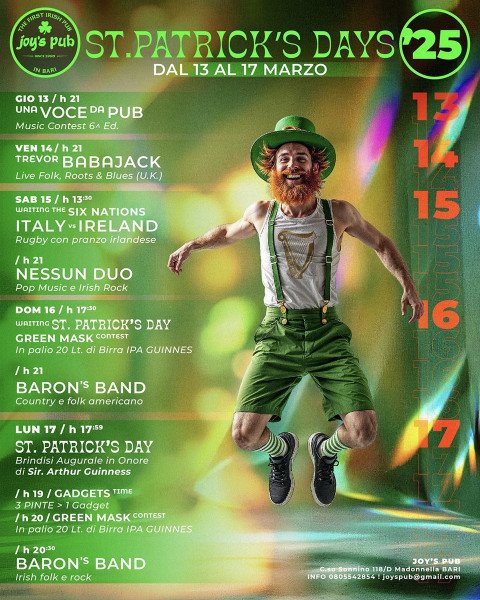 In occasione di San Patrizio dal 13 al 17 marzo 2025, il Joy’s Pub organizza numerose serate di musica, amicizia, maschere, foto, gadget, cibo e birra verde. A Bari, l’appuntamento è al solito posto in Corso Sidney Sonnino, 118 con ingresso libero a partire dalle ore 17:30.